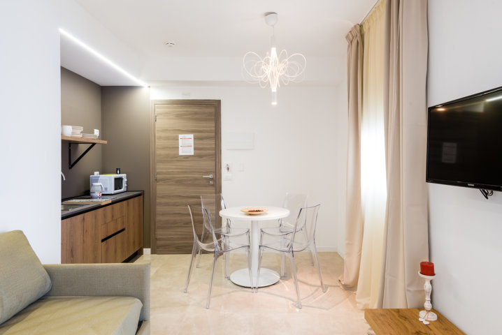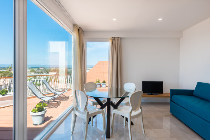 террасой, телевизором и мини-кухней с микроволновой печью и холодильником, гостиной и